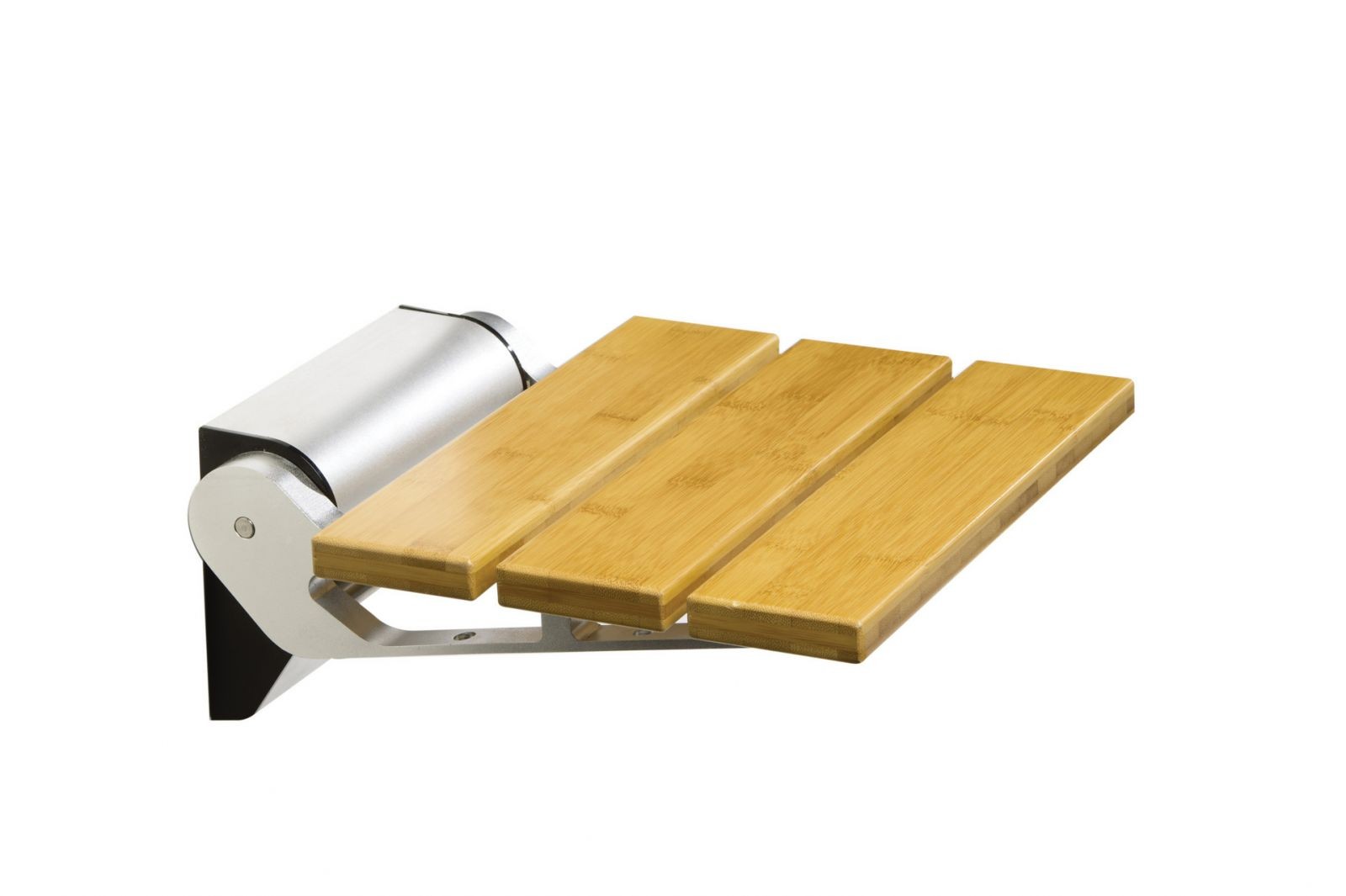 Seduta comfort per doccia, ribaltabile in bambù con struttura in alluminio resistente all’acqua Portata max. 150 kg Placca di fissaggio con 5 tasselli